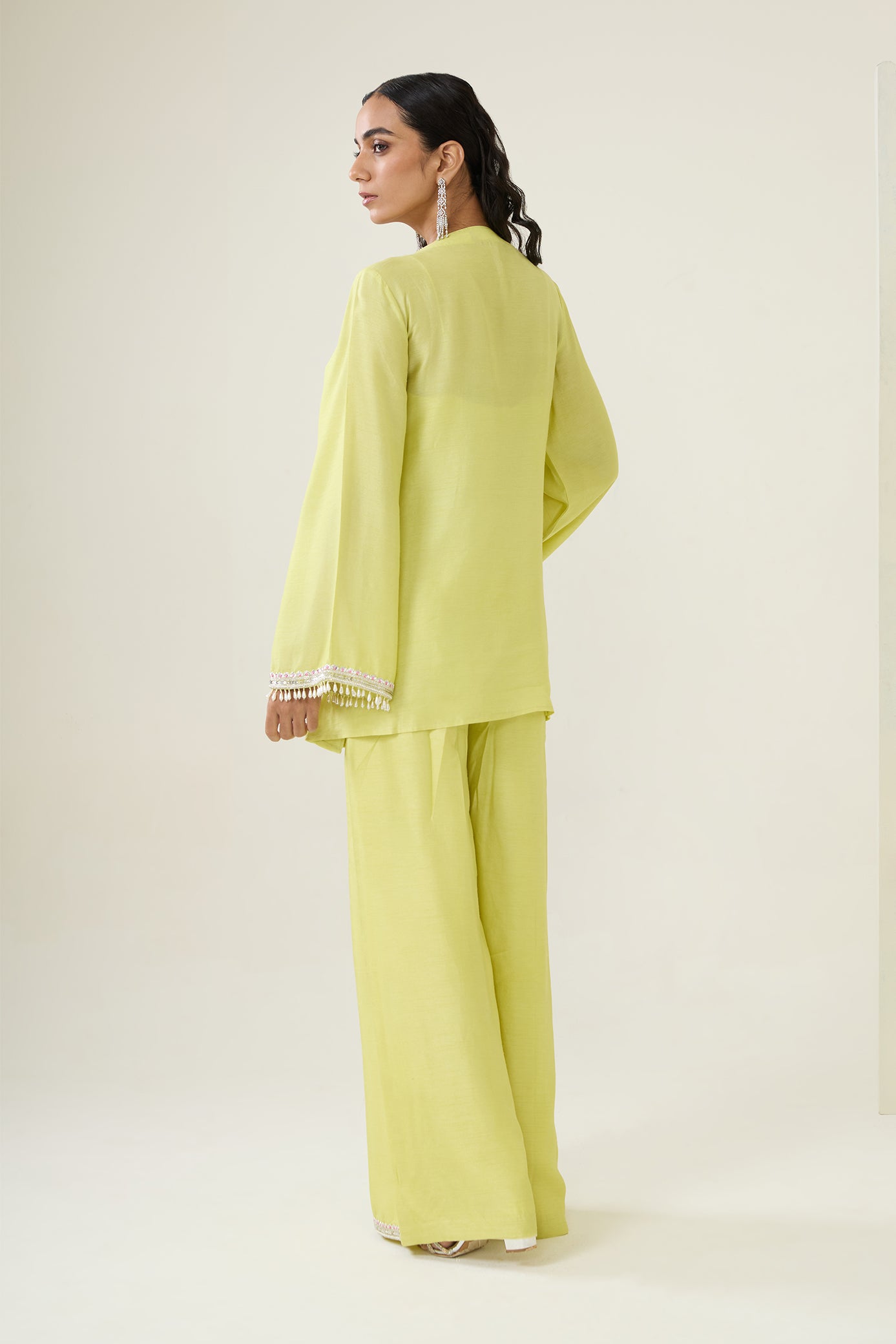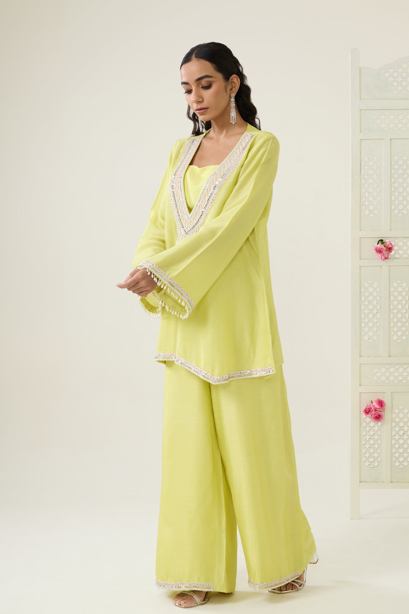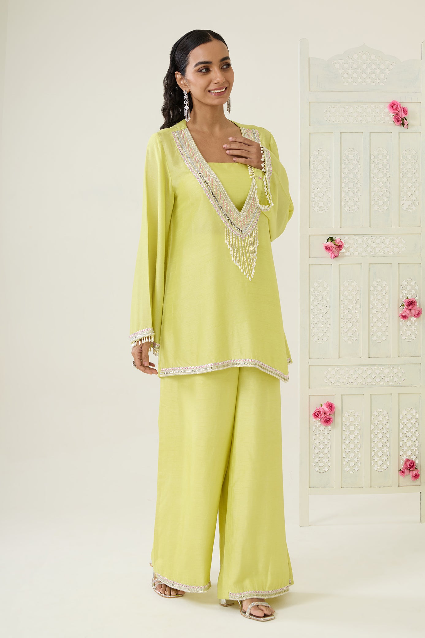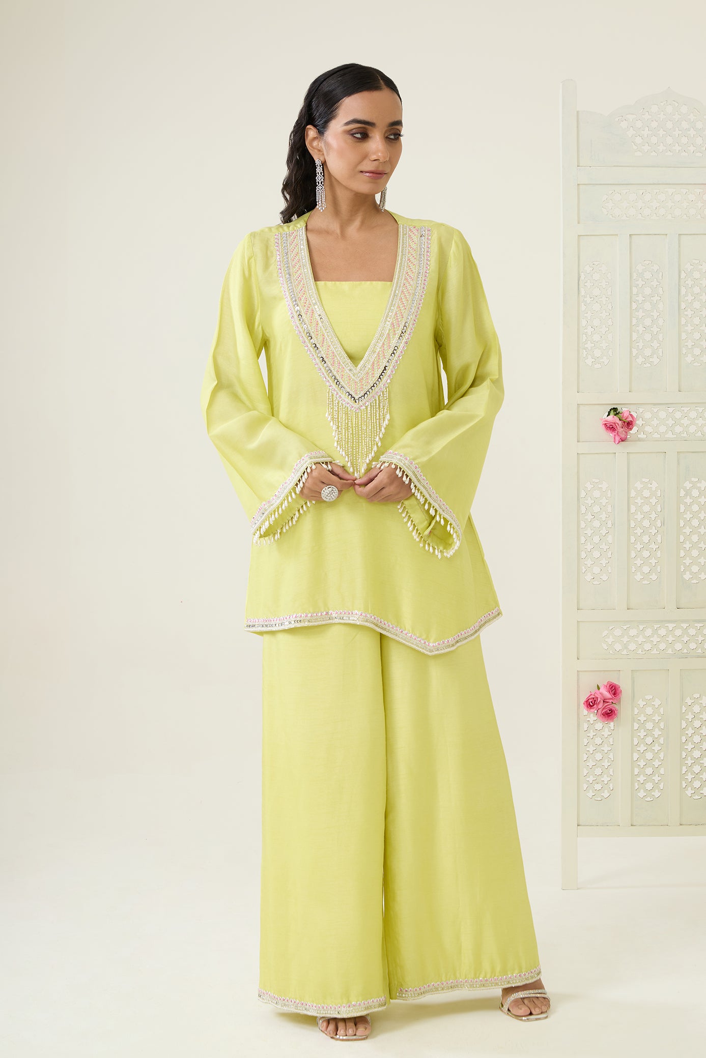 • Lemon -Yellow three-piece set featuring a padded smocked bustier, wide-leg palazzo pants, and an asymmetric deep V-neck kurta with bell sleeves. The ensemble is embellished with intricate sequin, cutdana, resham, and zardosi embroidery across the neckline, hemline, and sleeves. The look is completed with a centerpiece design highlighted by dangling embellished tassels.